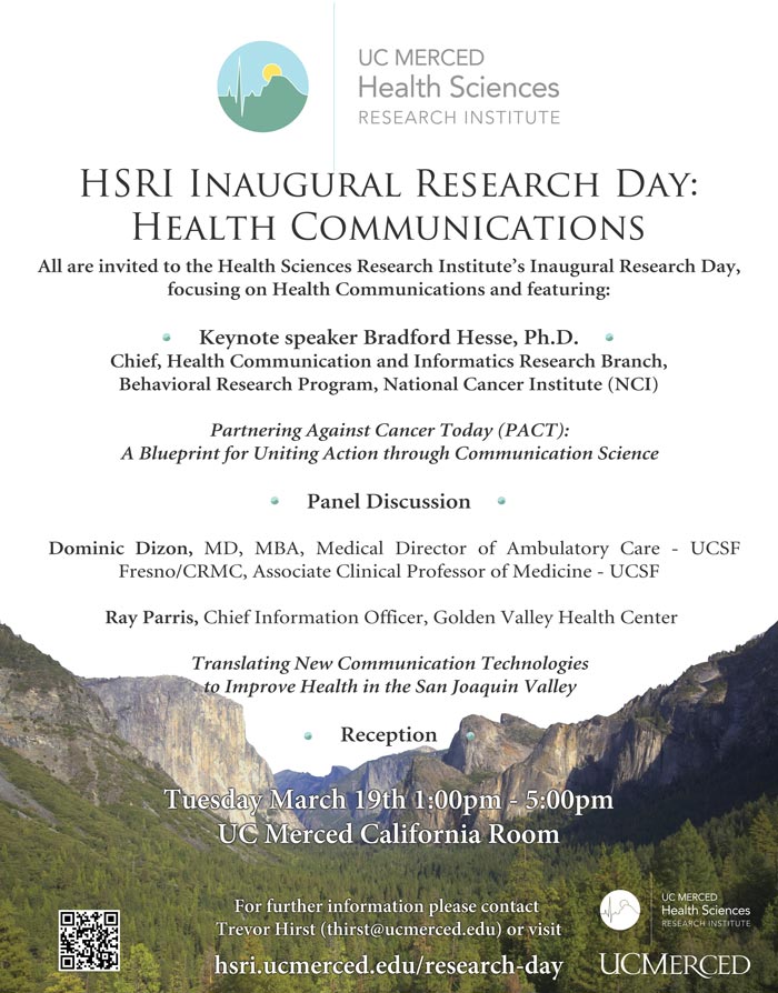 Please join us for the Health Sciences Research Institute’s Inaugural Research Day on Health Communications at 1:00pm on Tuesday March 19th 2013 in the UC Merced California Room. The schedule for the day is :
